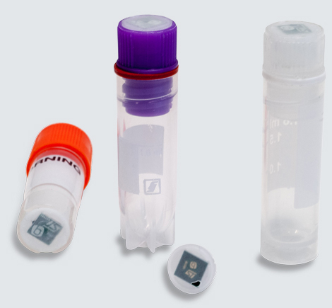 Bluechiip Retrofit Buttons are being used by several biorepositories in the USA, China and Australia in the field of stem cell therapies, virology and cancer research. The button is most commonly attached to a Nalgene 1.5ml tube, which enables facilities to keep the same vial supplier and sizes for automation. The button also fits vial sizes from Nalgene, Wheaton, Greiner BioOne and CryoBioSystem, which have similar bottom skirt diameters. The buttons are permanently attached to the tubes via a cryogenic glue or ultrasonic welding